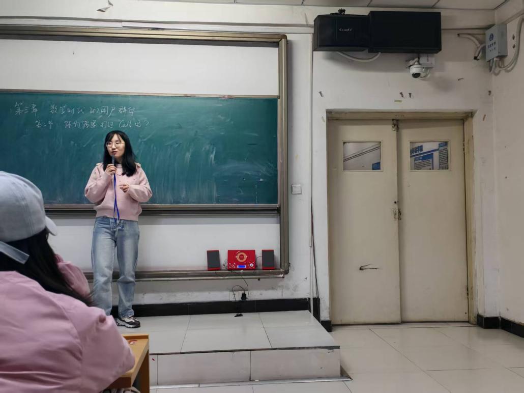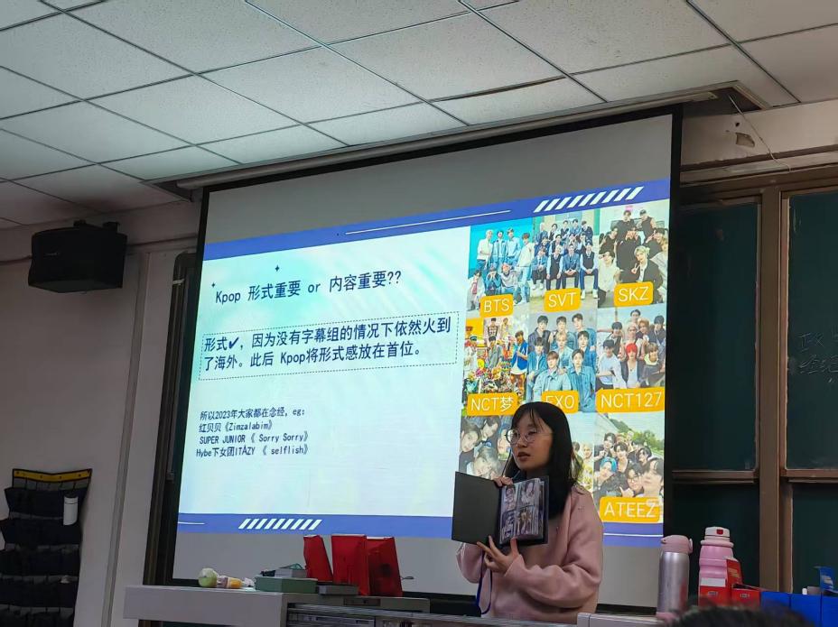 在导入环节中没有像往常一样打开多媒体投影,而是将一台满载时光记忆的CD机放在讲台上,在学生们好奇目光的注视下,任老师按下播放键,光盘转动,教室里随即流淌出了轻柔美妙的歌声。这首来自数字音乐时代之前的实体唱片音质,仿佛带着一种时间的质感,瞬间抓住了所有人的耳朵。“有同学知道这是谁的歌吗?”同学们中有回答正确的,鞠婧祎,一个选秀时代的“Queen”,任老师引入到:“从特定组合的单飞成员到如今依然活跃在荧幕前,她和她所代表的‘粉丝经济’现象,正是我们今天要探讨的话题。”这种实物带来的充满仪式感的开场,将一个关于偶像、粉丝与商业运作的美好图景展开。