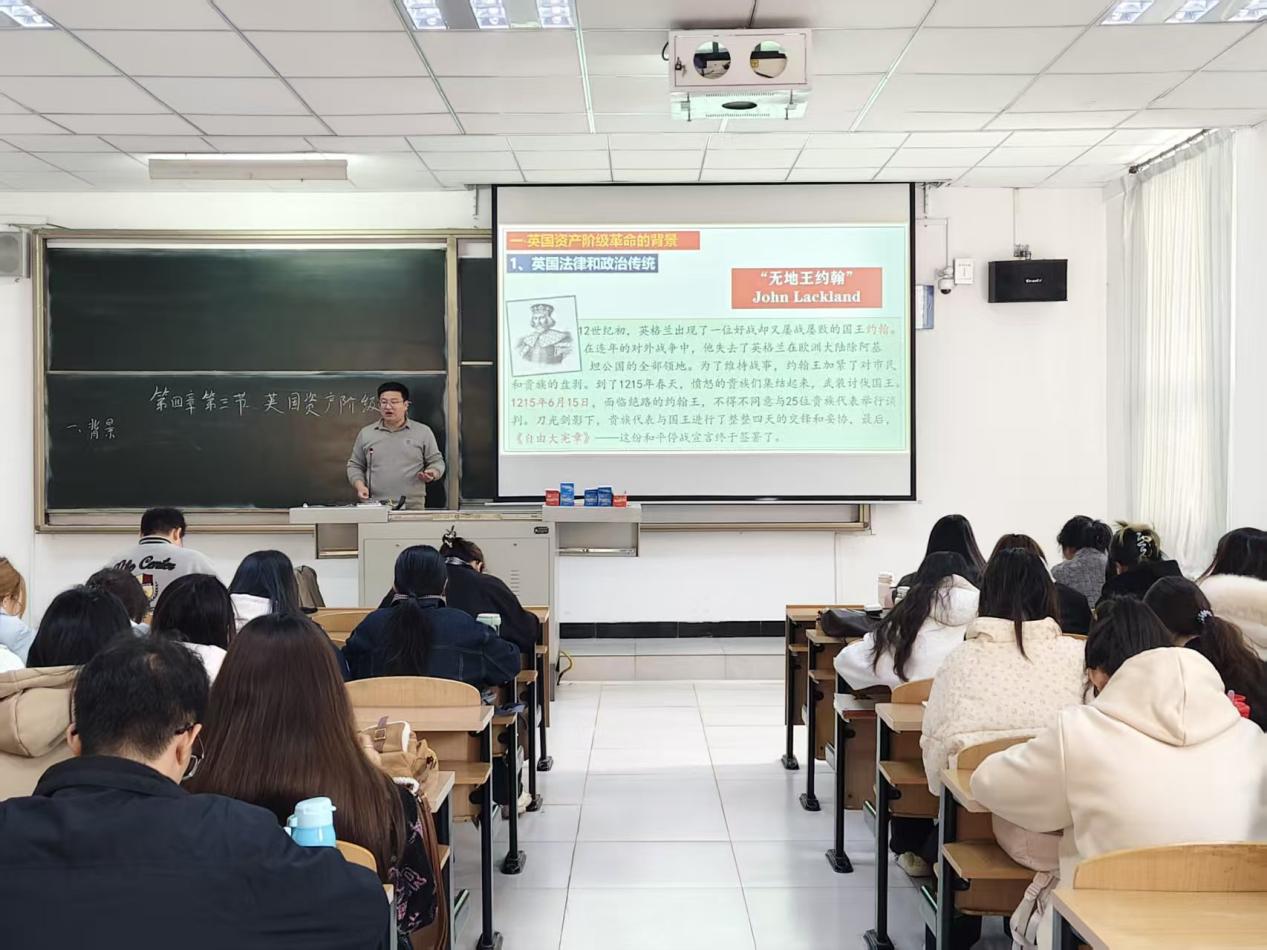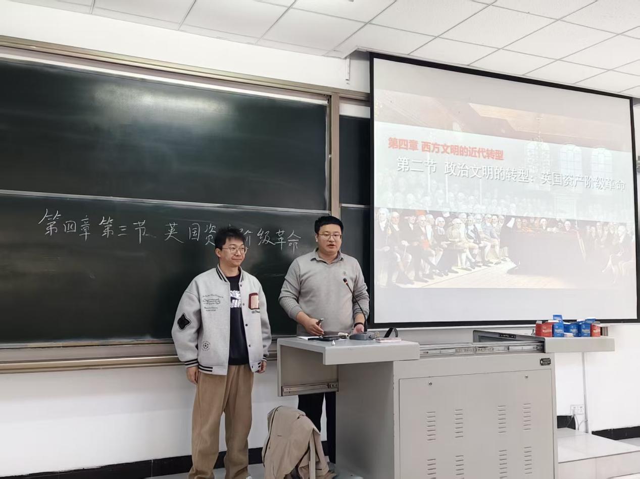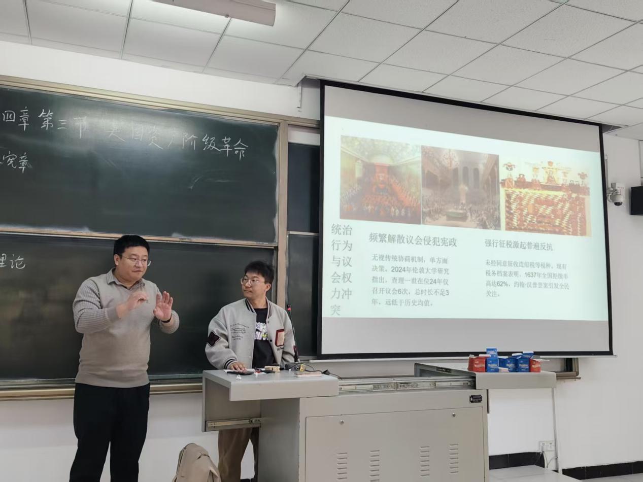 近日,《世界文明的历程》课堂上呈现了一场别开生面的“跨界对话”。历史学专业背景的赵亚楠老师联合心理学专业背景的赵凯老师以“英国资产阶级革命”为切入点,融合历史脉络梳理与心理学视角解读,打造了一堂兼具学术深度与思维张力的双师共研课,生动诠释跨学科教学的独特魅力。