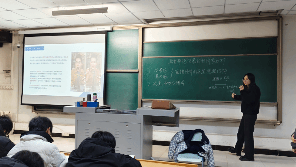 在理论融合环节,两位教师交替阐释、互为注脚。杨老师运用“消费者剩余”“交易成本”等概念,说明李佳琦等头部主播如何通过个人信用背书,大幅降低信息不对称带来的决策成本;任老师则引入“使用与满足理论”和“拟态亲密关系”,揭示“所有女生”这一称呼如何构建虚拟社群,满足用户的陪伴、归属与情感释放需求。学生在两种学科语言的交织中,真切体会到:直播经济的成功,既源于效率提升,更依赖意义共建。