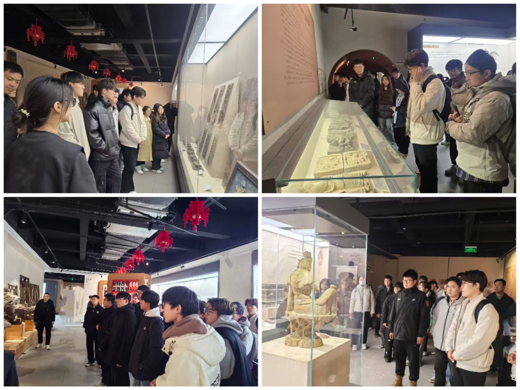 “大家看这件砖雕,线条细腻流畅,刻的是‘福禄寿’三星图案,这正是山西砖雕技艺的精髓所在……”一走进非遗馆,赵云老师就化身为“文化向导”,带领同学们逐一参观馆藏的砖雕、木雕、石雕藏品。展柜里,历经岁月沉淀的非遗珍品静静陈列,有的木雕纹饰繁复精美,展现着古代工匠的巧夺天工;有的石雕造型古朴大气,承载着三晋先民的生活智慧。同学们一边认真聆听讲解,一边拿出手机拍照记录,不时发出阵阵赞叹,眼神里满是对这些传统技艺的好奇与向往。
