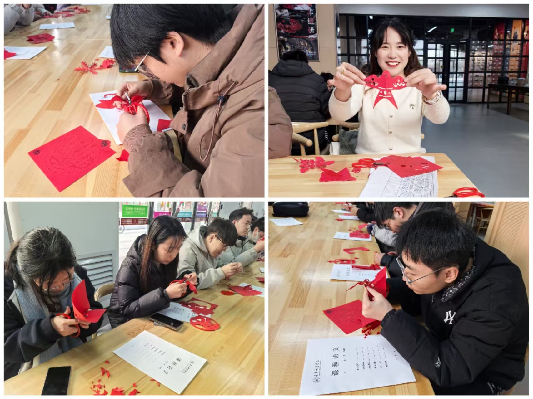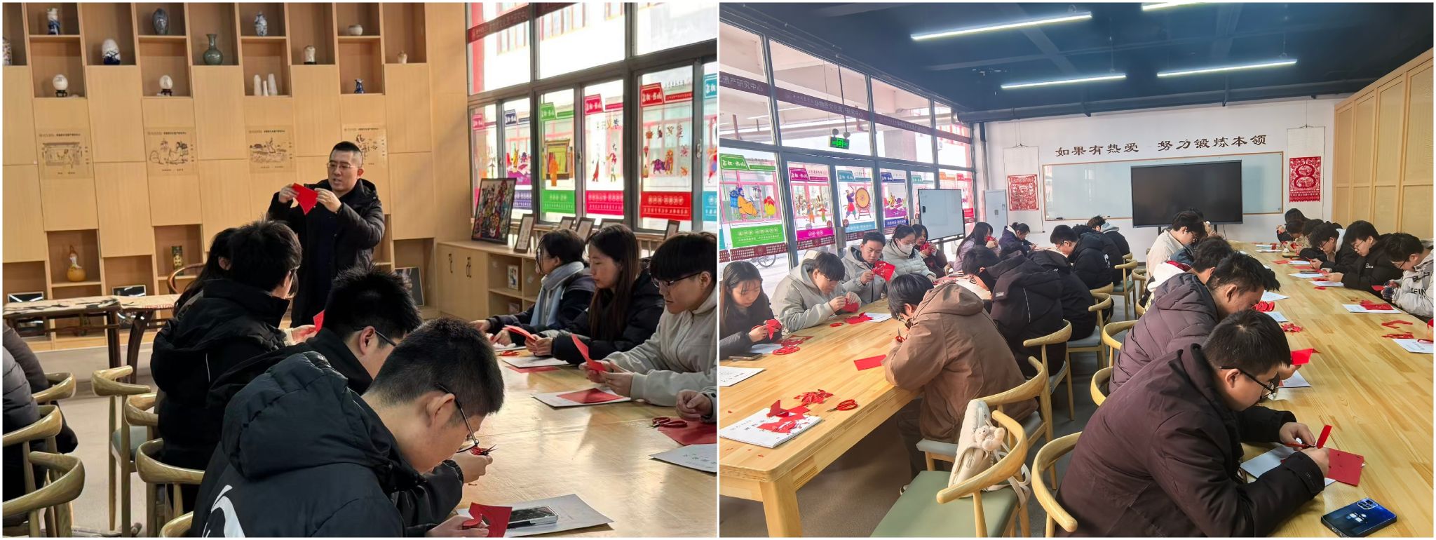 参观环节意犹未尽,实操体验更是让现场气氛推向高潮。在剪纸体验区,赵云老师先为大家讲解了山西剪纸的历史渊源和基本技法,从折纸的角度到剪刀的力度,都耐心细致地进行示范。“原来一张普通的彩纸,能剪出这么多花样!”同学们跃跃欲试,纷纷拿起剪刀和彩纸,跟着老师的步骤一步步操作。