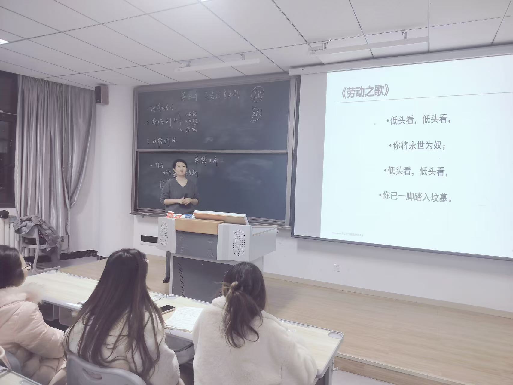 围绕芳汀的悲剧命运,两位老师进一步展现“文学叙事”与“舞台情感”的对比分析。董老师展示了欧洲女工生存插画,引导学生先建立现实背景,再对比原著中冷静克制的叙述方式,王老师则通过唱段《I Dreamed a Dream》高度情绪化的舞台呈现对比两种艺术的异同