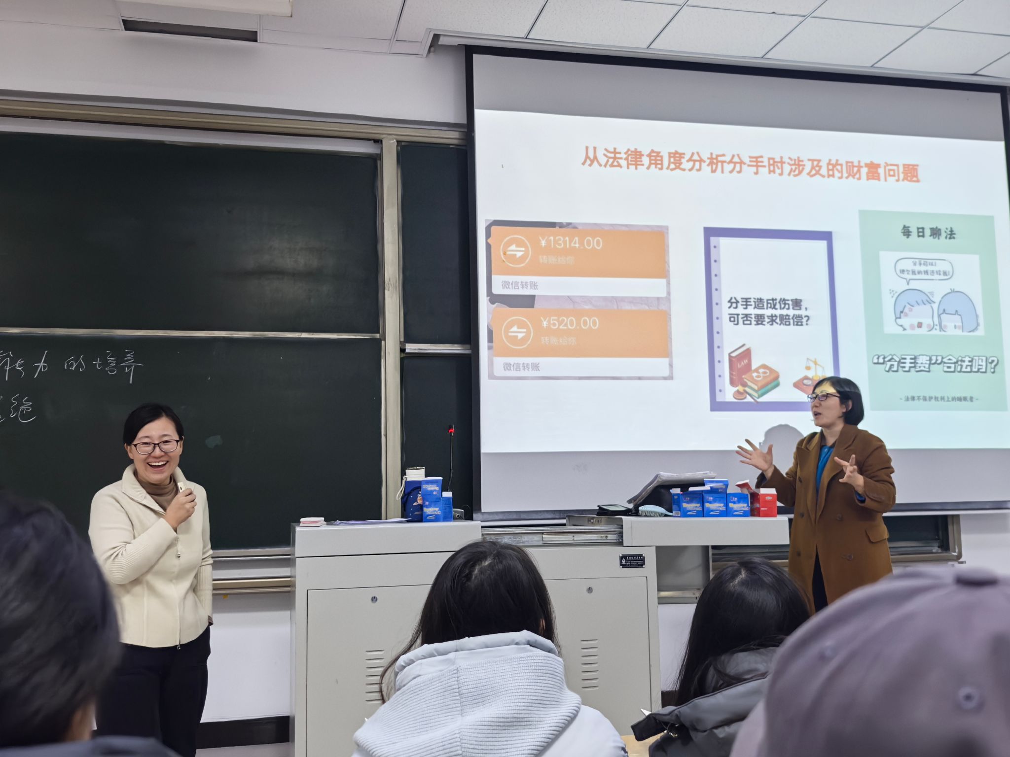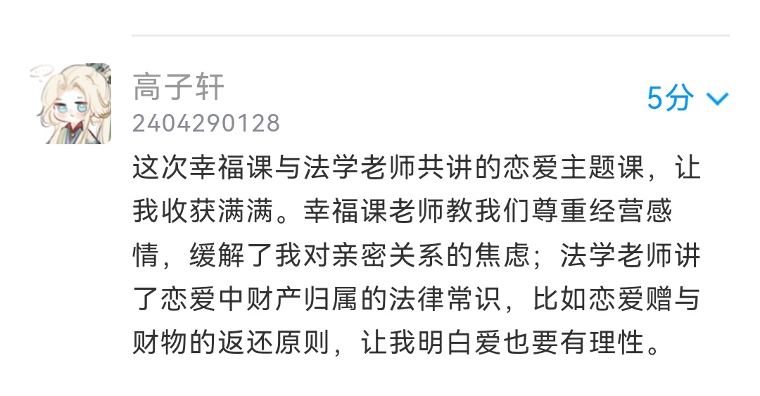 对于分手时涉及的财富问题,徐老师也从法学的视角通过真实案例帮助同学们分析恋爱中的法律问题,如520、1314特殊意义的转账记录是无法追回的,以及预防爱情中的网络诈骗,引导学生正确区分赠与、借款、附条件赠与,通过真实案例引导学生严守人格边界,杜绝隐私与名誉侵权。