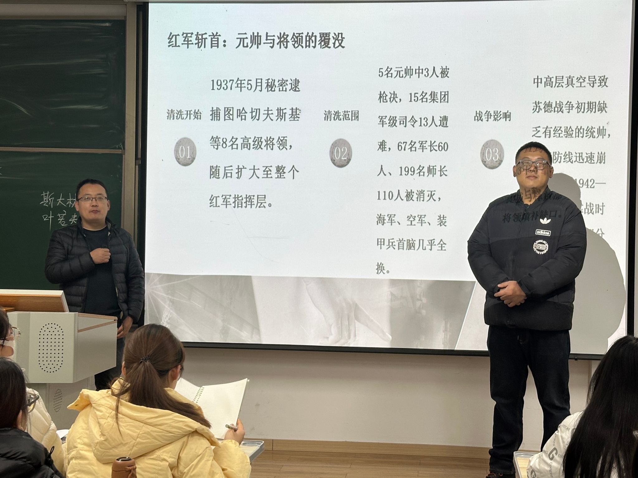 艺术的明亮叙事告一段落,张老师接过讲解主线,将视角拉回1936年的苏联社会现场。投影切换至“肃反运动(大清洗)” 的主题页,沉重的历史细节随之铺展:“1936年的莫斯科审判,是大清洗的第一波高潮,数万党员、军官、知识分子甚至普通民众被无端指控为‘敌人’,随即陷入逮捕、审判的漩涡。”